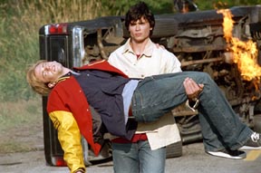 The story includes a paragraph about the show and its stars (whom the author describes as "really hot"), and is accompanied by a picture of Tom Welling's Clark rescuing Whitney (played by Eric Johnson) from the show's second episode, "Metamorphosis." You can see the photo to the right.