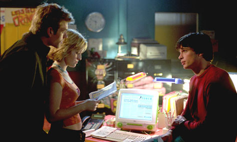 Eric Johnson as Whitney, Allison Mack as Chloe, and Tom Welling as Clark Kent, from the episode "Obscura"
