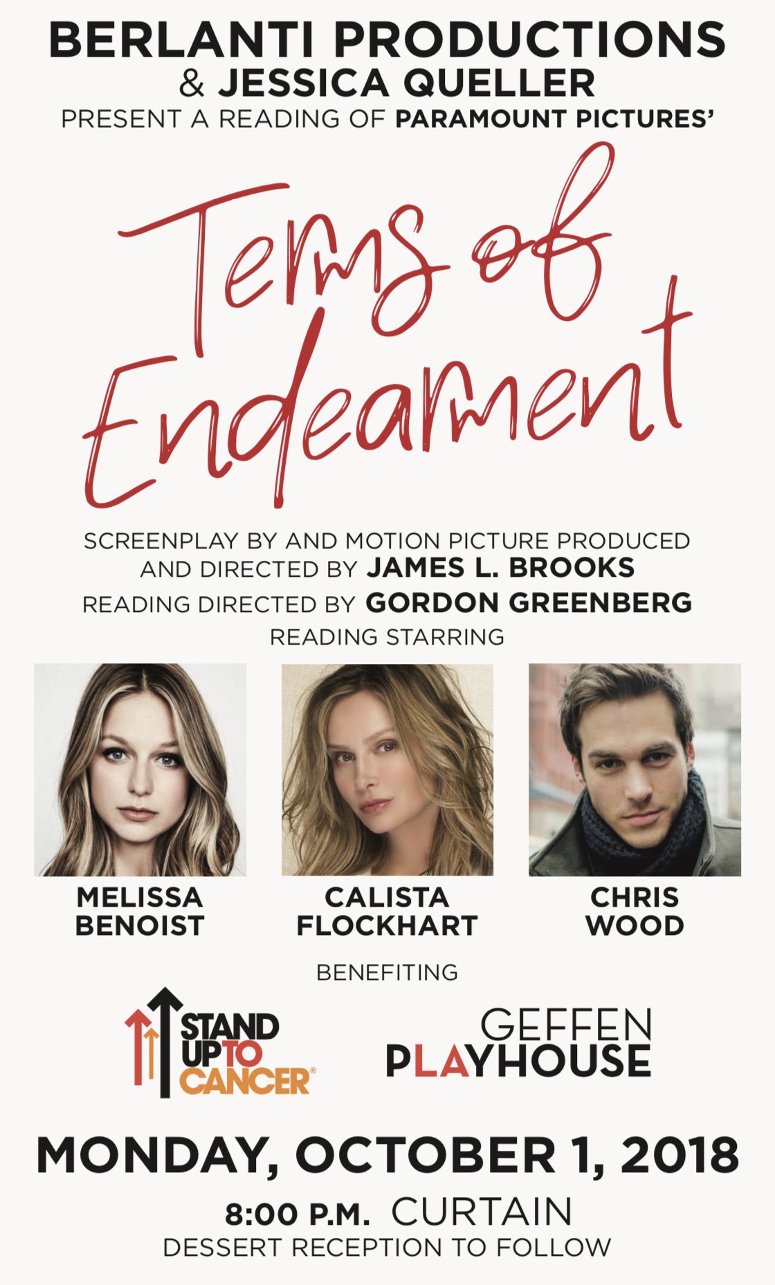 Melissa Benoist, Chris Wood, and Calista Flockhart will be participating in a live reading of Terms of Endearment to benefit Stand Up to Cancer and the Geffen Playhouse.
