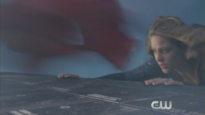 Thanks to Mr. Video, we have screen captures from this clip, which starts with Clark Kent and ends with a Supergirl/Superman team-up and rescue. Melissa Benoist is in it too, of course; you can also find Mehcad Brooks (James), Calista Flockhart (Cat), and even Cat’s new assistant within. (Spoilers!)