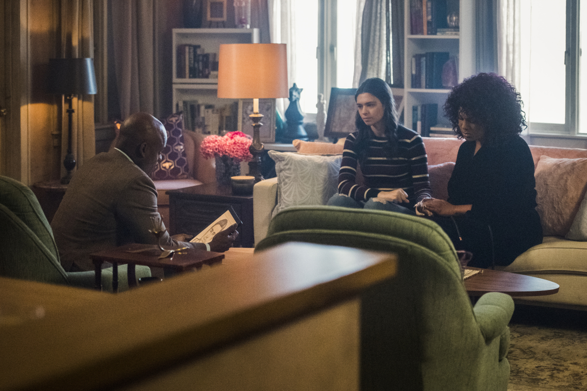 Supergirl -- "Reality Bytes" -- Image Number: SPG515B_0001b.jpg -- Pictured (L-R): Doron Bell as Detective Rivers, Nicole Maines as Nia Nal/Dreamer and Roxy Wood as Yvette -- Photo: Dean Buscher/The CW -- © 2020 The CW Network, LLC. All rights reserved.