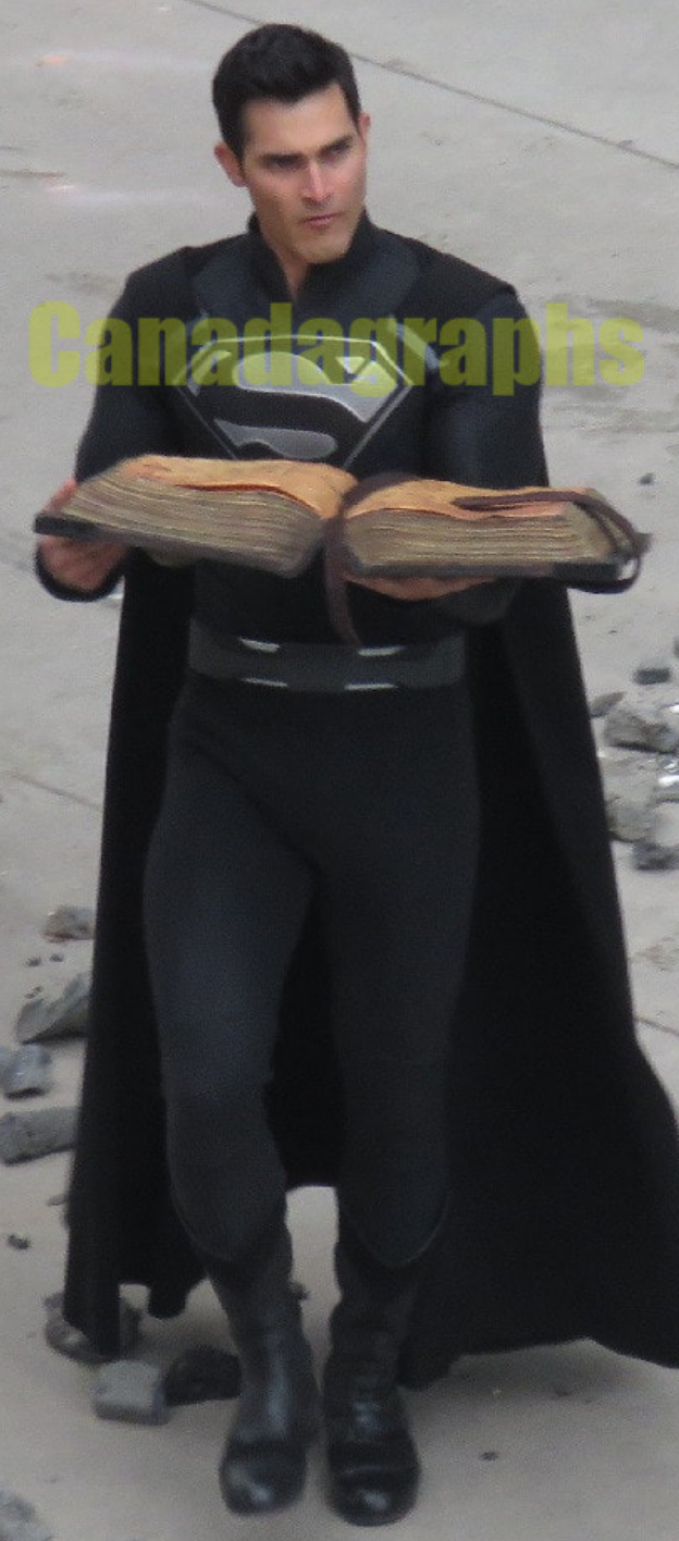 In a series of photos — all of which you can see here — it looks like there’s a battle that goes on in what might be a Kryptonian Fortress (see the giant “S”). Barry Allen is the Flash again, Oliver Queen is Green Arrow, Supergirl is there… and there are two Supermen, one of whom is wearing the black costume seen on Tyler Hoechlin a few weeks back. In some shots there is also a giant book — the Book of Rao, maybe?