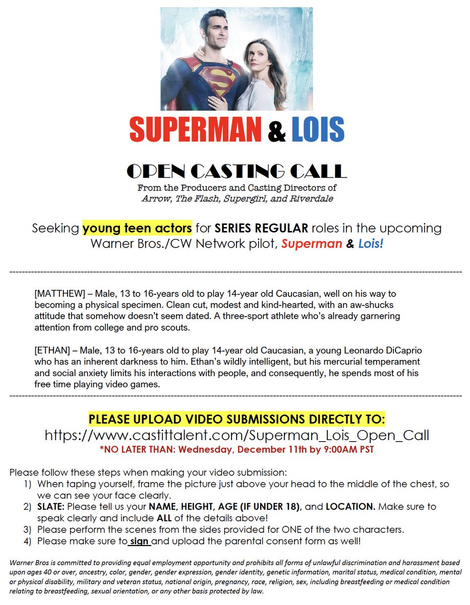 According to the GWW report, Superman & Lois is casting “Matthew” who is described as “a 14-year old caucasian boy, who is well on his way to becoming a physical specimen. Matthew is clean cut, modest and kind-hearted, with an aw-shucks attitude that somehow doesn’t seem dated. He is also a three-sport athlete who’s already garnering attention from college and pro-scouts.”