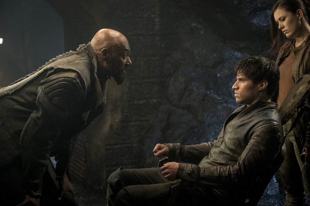 KRYPTON -- "House of Zod" Episode 105 -- Pictured: (l-r) Colin Salmon as Black Zero Operative, Cameron Cuffe as Seg-El -- (Photo by: Steffan Hill/Syfy)