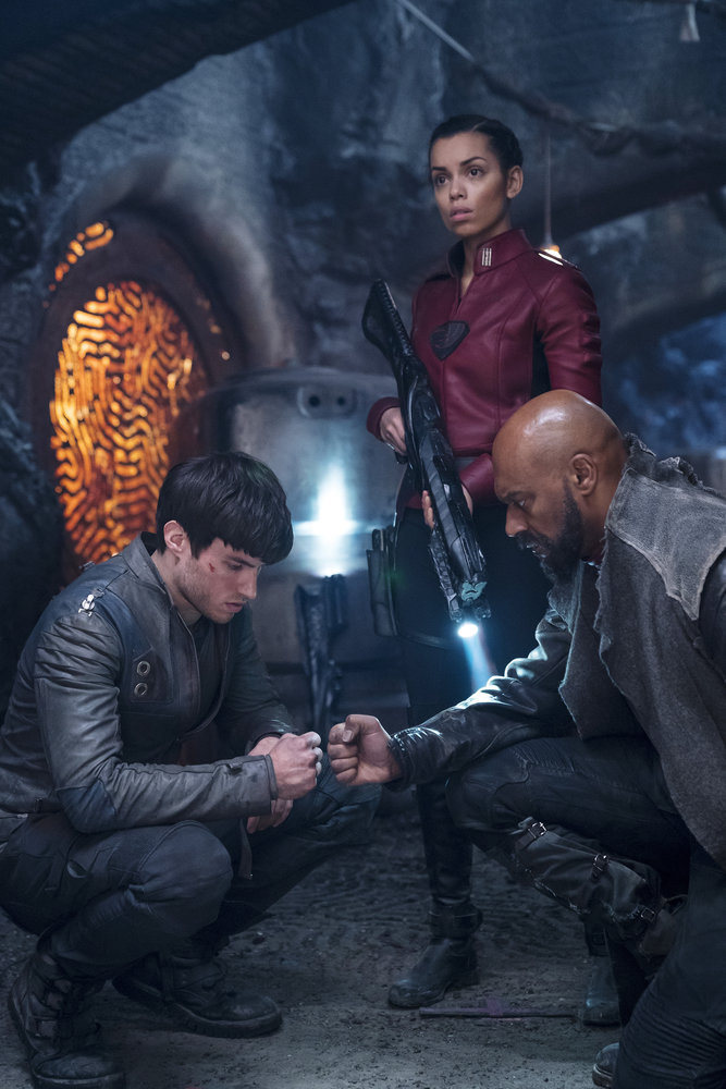 KRYPTON -- "Civil Wars" Episode 106 -- Pictured: (l-r) Cameron Cuffe as Seg-El, Georgina Campbell as Lyta-Zod, Colin Salmon as General Zod -- (Photo by: Steffan Hill/Syfy)