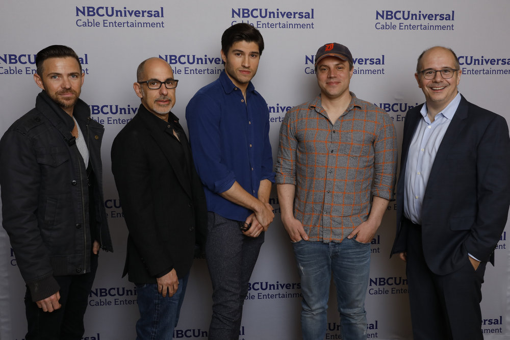 NBCUNIVERSAL EVENTS -- NBCUniversal Press Tour, January 2018 -- "Krypton" Cast -- Pictured: (l-r) Cameron Welch, Executive Producer; David S. Goyer, Executive Producer; Cameron Cuffe, Geoff Johns, President and Chief Creative Officer, DC Entertainment, Michael Sluchan, Senior Vice President, Current Scripted Programming & Mini Series, NBCUniversal Cable Entertainment -- (Photo by: Trae Patton/NBCUniversal)