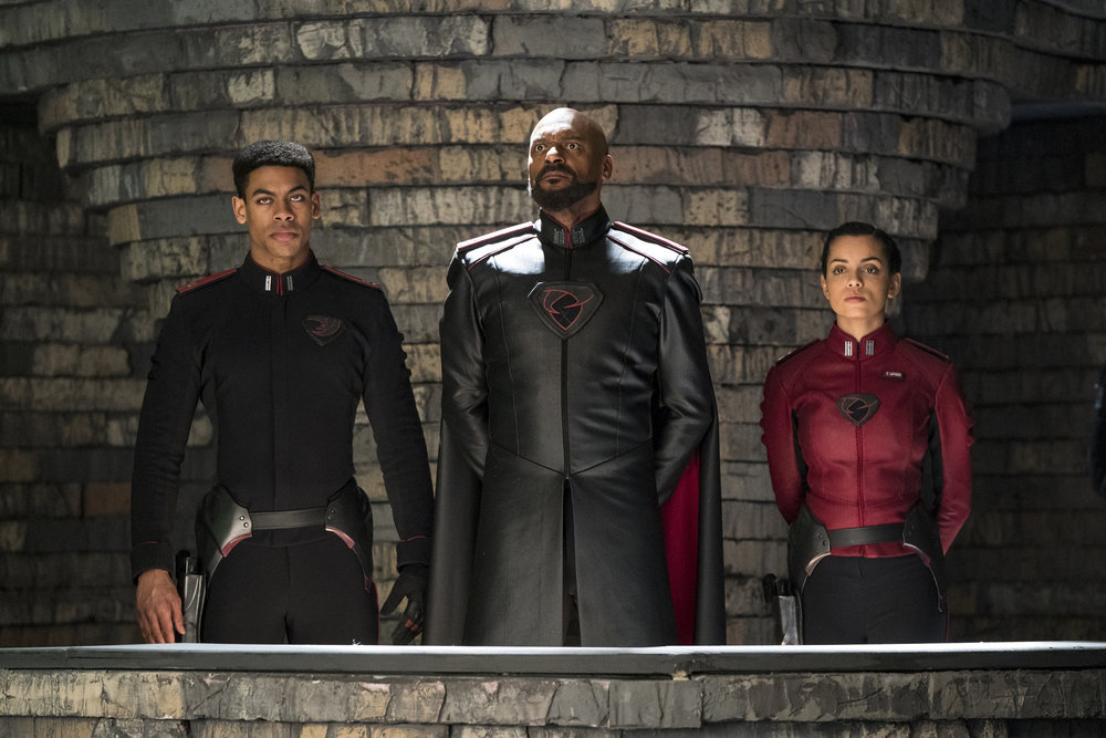 KRYPTON -- "The Phantom Zone" Episode 110 -- Pictured: (l-r) Aaron Pierre as Dev-Em, Colin Salmon as General Zod, Georgina Campbell as Lyta-Zod -- (Photo by: Steffan Hill/Syfy)