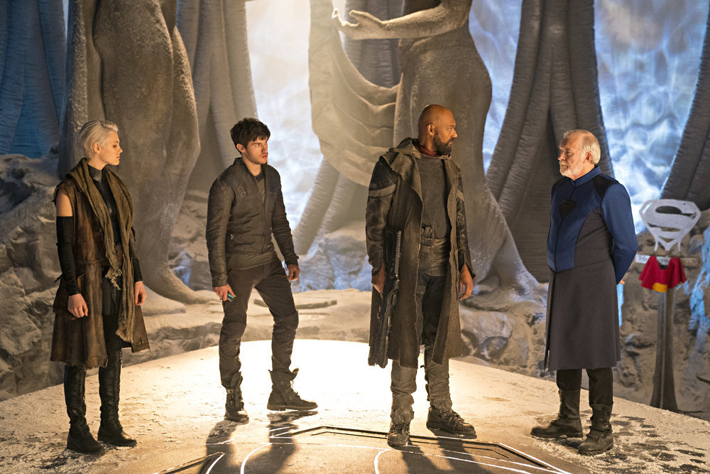 KRYPTON -- "The Phantom Zone" Episode 110 -- Pictured: (l-r) Wallis Day as Nyssa-Vex, Cameron Cuffe as Seg-El, Colin Salmon as General Zod, Ian McElhinney as Val-El -- (Photo by: Steffan Hill/Syfy)