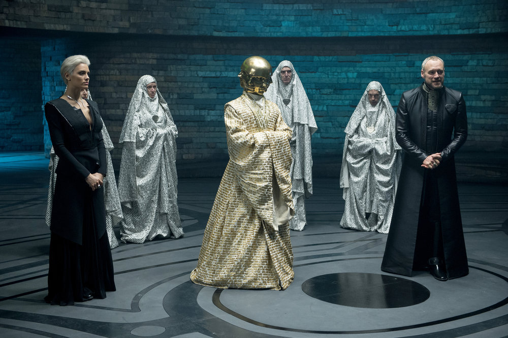 KRYPTON -- "House of El" Episode 102 -- Pictured: (l-r) Wallis Day as Nyssa-Vex, Blake Ritson as Brainiac, Elliot Cowan as Daron-Vex -- (Photo by: Steffan Hill/Syfy)
