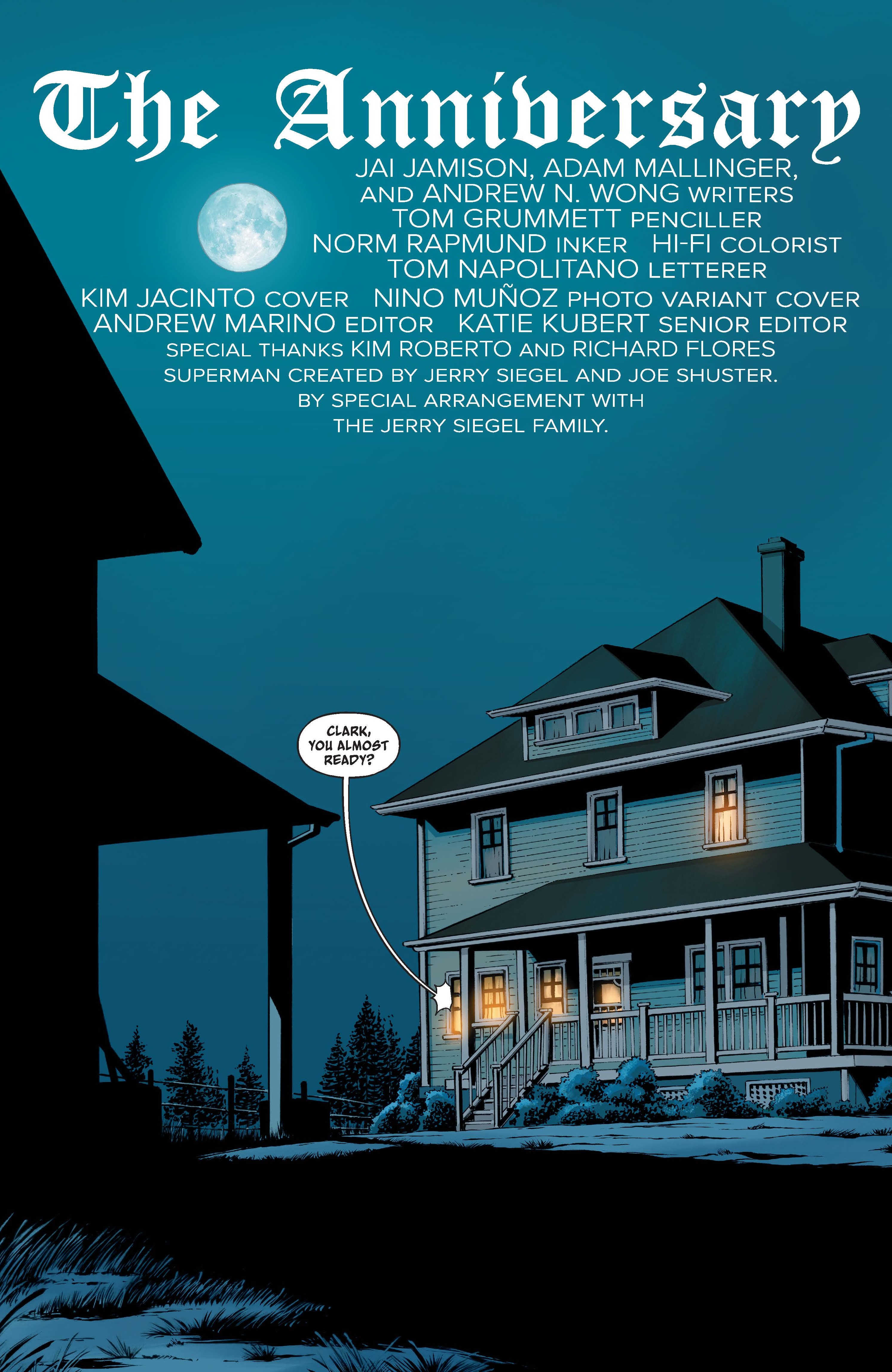 All of these people who I’ve worked with, just showed me incredible kindness, and it made a very difficult time easier, so I want to thank them for that. And specifically, when I pitched this idea to Jai and Andrew, they knew what it meant to me, and they were willing to let me run with the story. I cannot express how grateful I am, because from a certain point of view, it’s a little indulgent, maybe, to do what I did, and to pay tribute to my dad in there, but they were supportive, and Todd was supportive of that, and I will be forever grateful to them for that. It means more than I can say. This whole experience is always gonna be inseparable from that, and getting to tell the story meant a lot because it’s Clark looking at his relationship with his father, and I’ll be forever grateful to everybody who let me do that. I also want to thank our editor, Andrew Marino who was completely receptive when I asked to dedicate the story to my dad.