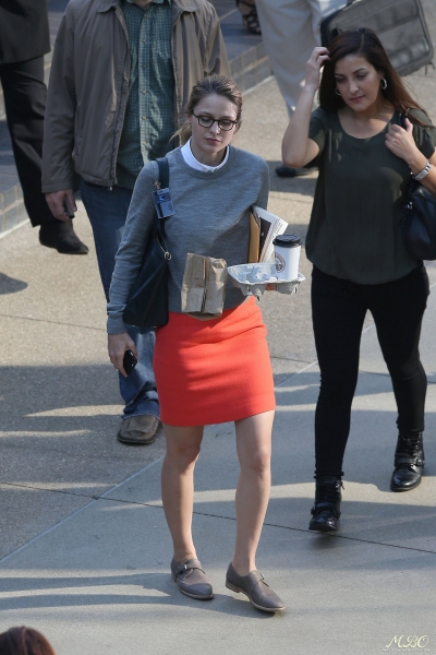 Photographers have caught some photos of Melissa Benoist in her alter ego of Kara Danvers, and now, they’ve also gotten some photos of Melissa on set with Mehcad Brooks (James Olsen).