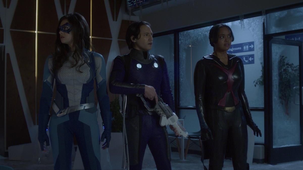 Supergirl -- “Lost Souls” -- Image Number: SPG604fg_0006r.jpg -- Pictured: Nicole Maines as Dreamer, Jesse Rath as Brainiac-5 and Sharon Leal as M’gann M’orzz. Photo: The CW -- © 2021 The CW Network, LLC. All Rights Reserved.