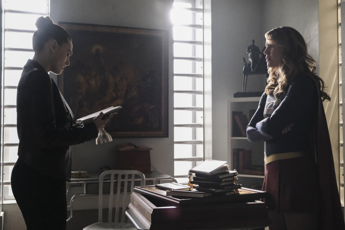 Supergirl -- "Crime and Punishment" -- Image Number: SPG418b_0267r.jpg -- Pictured (L-R): Katie McGrath as Lena Luthor and Melissa Benoist as Kara/Supergirl -- Photo: Bettina Strauss/The CW -- © 2019 The CW Network, LLC. All Rights Reserved.