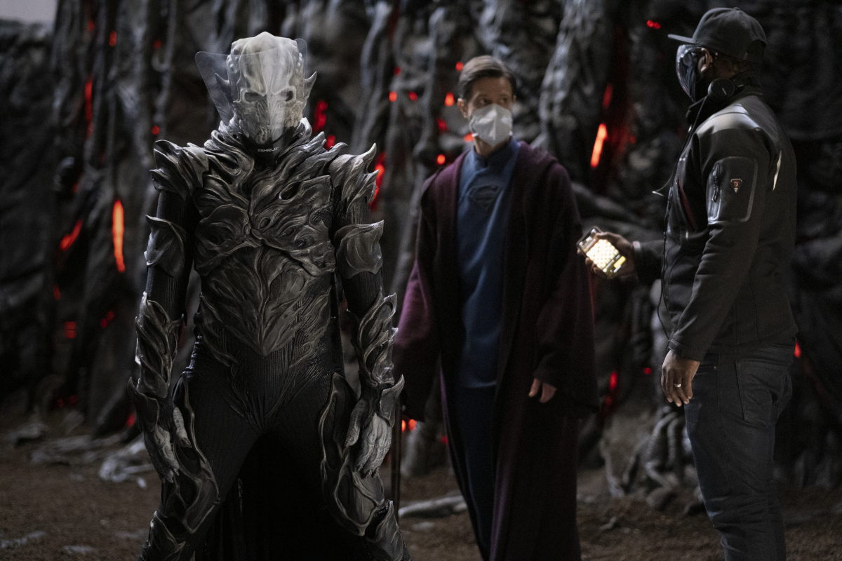 Supergirl -- “Fear Knot” -- Image Number: SPG607a_BTS_0323r.jpg_ -- Pictured: David Harewood directing Jason Behr as Zor-El— Photo: Bettina Strauss/The CW -- © 2021 The CW Network, LLC. All Rights Reserved.