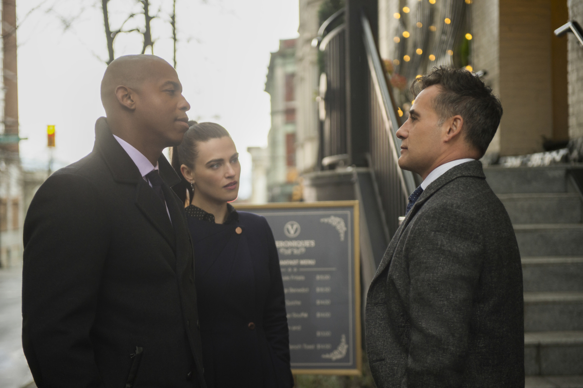 Supergirl -- "For Good" -- Image Number: SPG312b_0216.jpg -- Pictured (L-R): Mehcad Brooks as James Olsen, Katie McGrath as Lena Luthor and Adrian Pasdar as Morgan Edge -- Photo: Diyah Pera/The CW -- © 2018 The CW Network, LLC. All Rights Reserved.