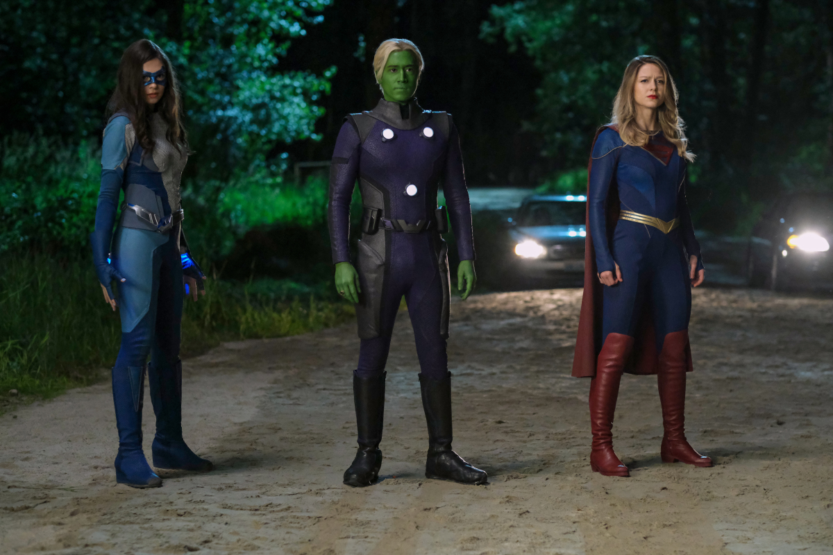 Supergirl -- “I Believe In A Thing Called Love” -- Image Number: SPG617a_0144r -- Pictured (L-R): Nicole Maines as Dreamer, Jesse Rath as Brainiac-5 and Melissa Benoist as Supergirl -- Photo: Bettina Strauss/The CW -- © 2021 The CW Network, LLC. All Rights Reserved.