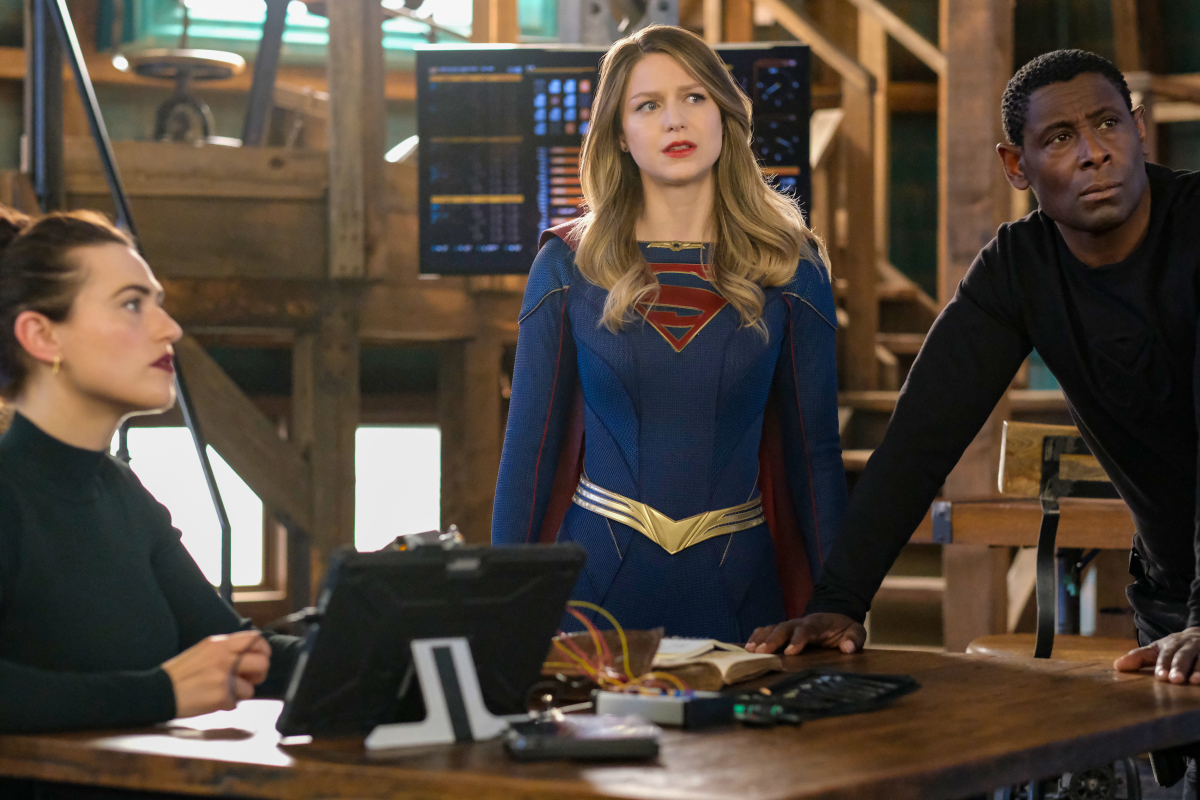 Supergirl -- “Nightmare in National City” -- Image Number: SPG616a_0223r -- Pictured (L-R): Katie McGrath as Lena Luthor, Melissa Benoist as Supergirl and David Harewood as J’onn J’onzz -- Photo: Bettina Strauss/The CW -- © 2021 The CW Network, LLC. All Rights Reserved.