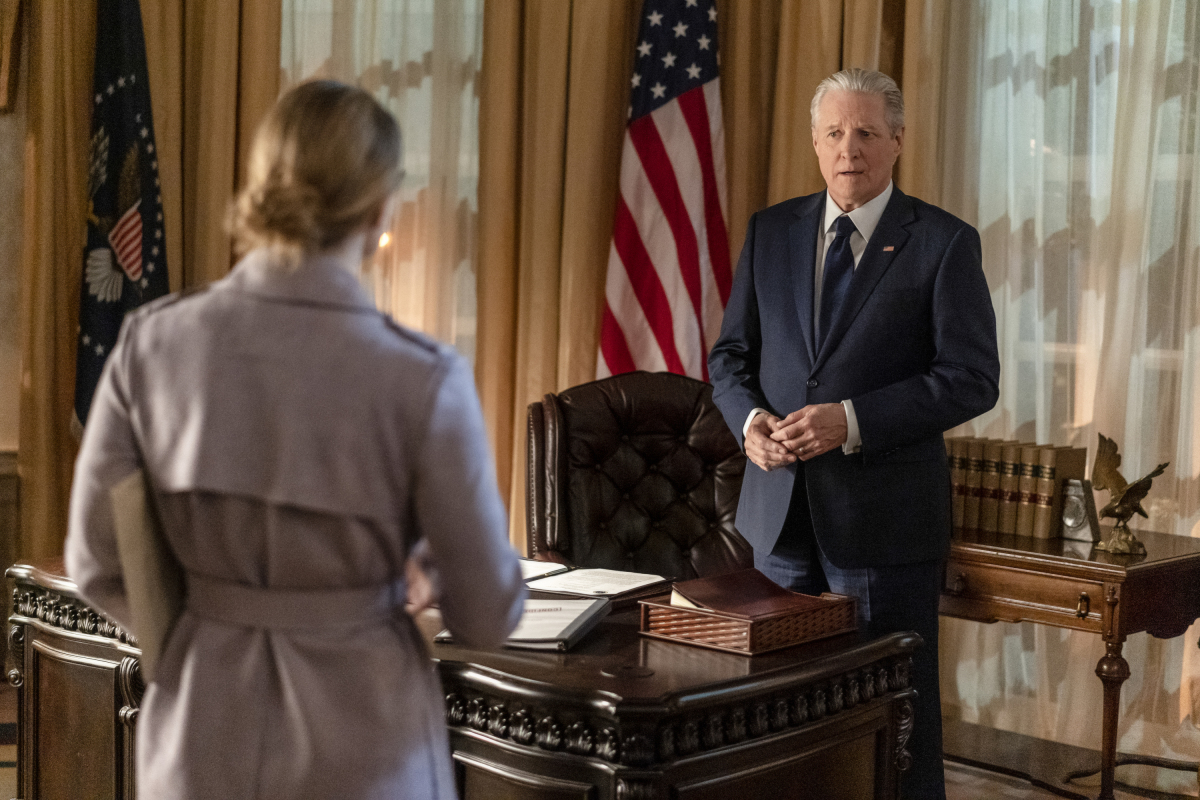 Supergirl -- "Will The Real Miss Tessmacher Please Stand Up?" -- Image Number: SPG420A_0219b.jpg -- Pictured (L-R): Melissa Benoist as Kara/Supergirl and Bruce Boxleitner as President Baker -- Photo: Colin Bentley/The CW -- © 2019 The CW Network, LLC. All Rights Reserved.