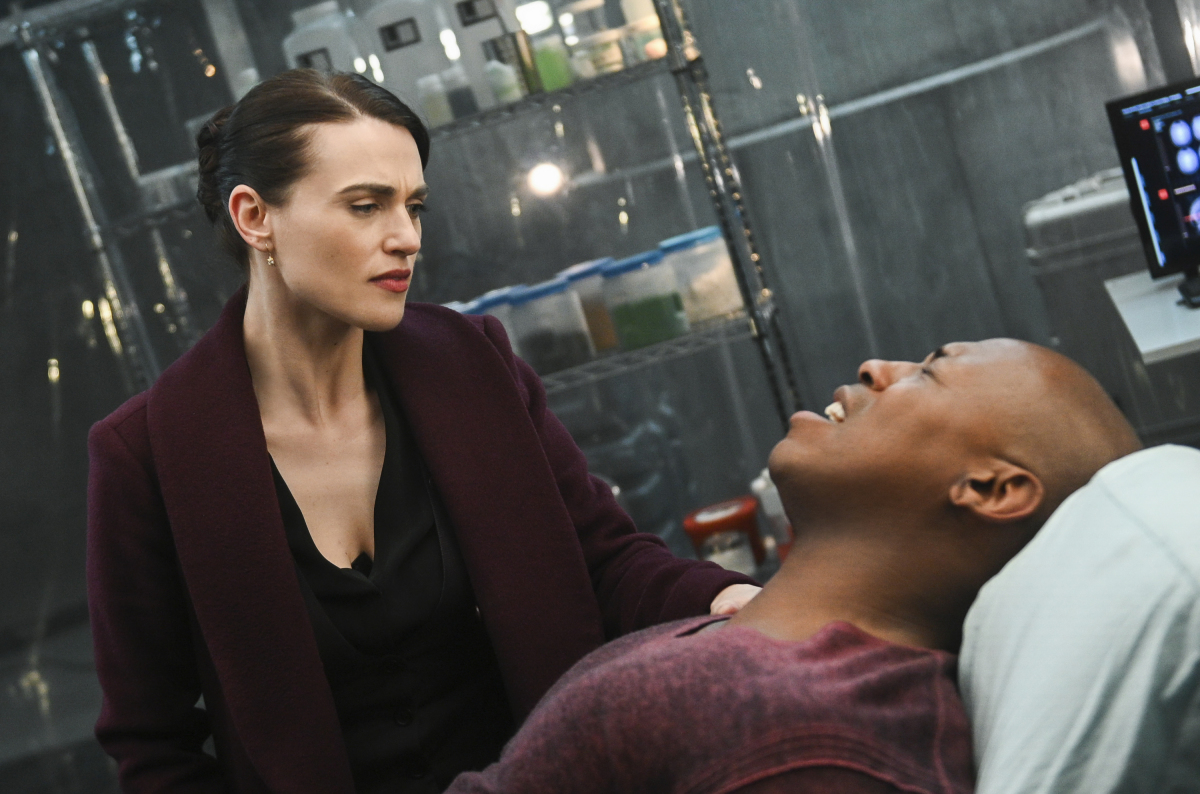 Supergirl -- "Red Dawn" -- Image Number: SPG421c_0623b.jpg -- Pictured (L-R): Katie McGrath as Lena Luthor and Mehcad Brooks as James Olsen/Guardian -- Photo: Sergei Bachlakov/The CW -- © 2019 The CW Network, LLC. All Rights Reserved.