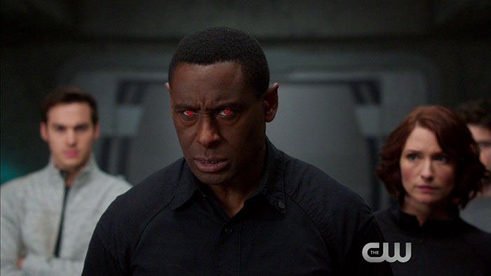 The episode is called “Distant Sun” and while we don’t have any official photos yet, we do have some screen captures from the episode’s trailer courtesy of Mr. Video… and now we have a trailer, too! Granted, this trailer doesn’t have Lynda Carter in it, but it does have some Kara vs. Mon-El action, some Teri Hatcher and Kevin Sorbo, and some aliens “from the mind of director Kevin Smith!” And, dang, does Mon-El (Chris Wood) get smacked around more than once next week!