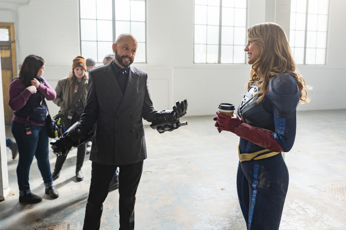 Supergirl -- "The Quest for Peace" -- Image Number: SPG422B_BTS_0274b.jpg -- Pictured (L-R): Behind the scenes with Jon Cryer and Melissa Benoist -- Photo: Robert Falconer/The CW -- © 2019 The CW Network, LLC. All Rights Reserved.