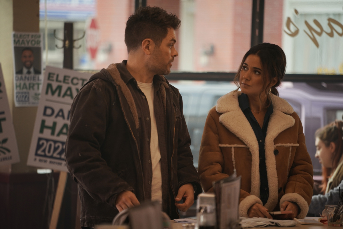 Superman & Lois -- "The Ties that Bind" -- Image Number: SML202b_0122r.jpg -- Pictured (L-R): Erik Valdez as Kyle Cushing and Emmanuelle Chriqui as Lana Lang -- Photo: Shane Harvey/The CW -- (C) 2021 The CW Network, LLC. All Rights Reserved