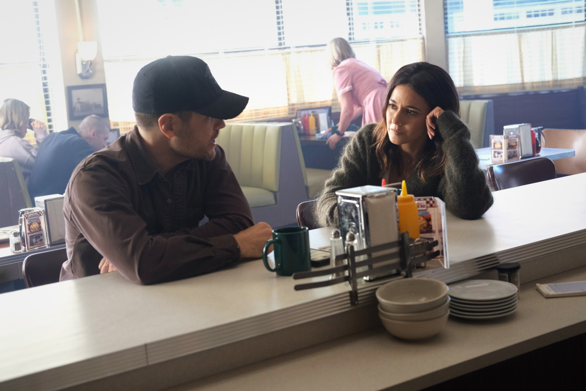 Superman & Lois -- "Fail Safe" -- Image Number: SML113a_0207r.jpg -- Pictured (L-R): Erik Valdez as Kyle Cushing and Emmanuelle Chriqui as Lana Lang Cushing -- Photo: Bettina Strauss/The CW -- © 2021 The CW Network, LLC. All Rights Reserved
