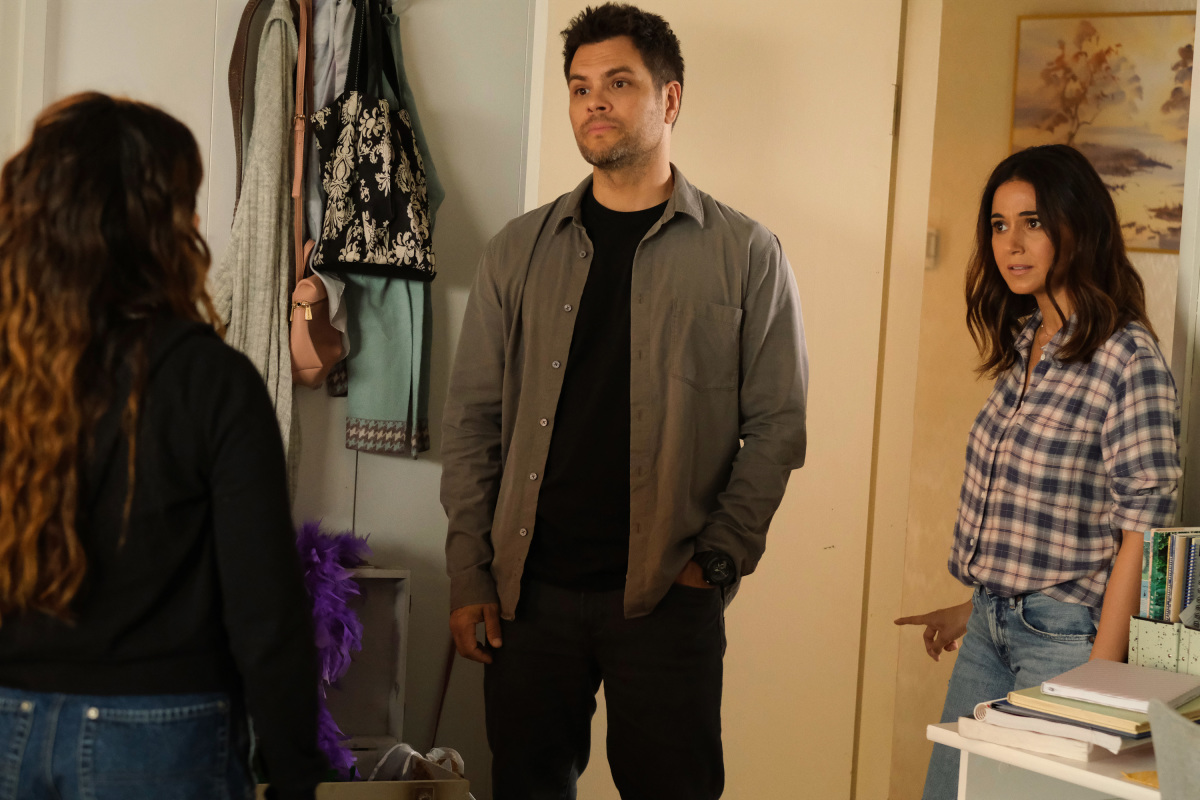 Superman & Lois -- "The Eradicator" -- Image Number: SML114c_0458r.jpg -- Pictured (L-R): Inde Navarrette as Sarah Cushing, Erik Valdez as Kyle Cushing and Emmanuelle Chriqui as Lana Lang Cushing -- Photo: Bettina Strauss/The CW -- © 2021 The CW Network, LLC. All Rights Reserved