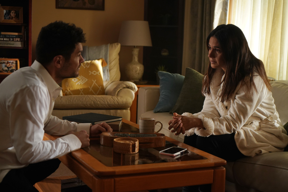 Superman & Lois -- "Tried and True" -- Image Number: SML206a_210r.jpg -- Pictured (L-R): Erik Valdez as Kyle Cushing and Emmanuelle Chriqui as Lana Lang Cushing -- Photo: Shane Harvey/The CW -- (C) 2022 The CW Network, LLC. All Rights Reserved