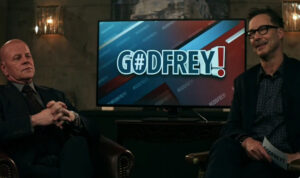 In many versions of the story Godfrey has been a talk show host of some sort, and on Superman & Lois it was no exception. The on-air graphics resembled the FOX show Gutfeld! in many ways, right down to the exclamation point. Interestingly, though, this look for Cavanagh was slightly different than anything we’ve seen for any Wells incarnation.